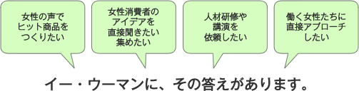 イー・ウーマンでは、働く女性のインターネット調査、商品開発、女性活用、人材研修、講師派遣、フォーカスグループ、ミステリーショッパー(覆面調査)などを提供しています。アイディア豊富な働く女性消費者たちの声を、活用しませんか?