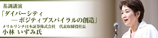 第13回「国際女性ビジネス会議」の基調講演は、メリルリンチ日本証券株式会社代表取締役社長、小林いずみさん。メリルリンチは、ニューヨークを拠点に「ダイバーシティ&インクルージョン」をすでに経営の柱にしており、外部のアドバイザリーも招き、ダイバーシティには熱心に取り組んできている会社です。東京にあるメリルリンチ日本証券でも、すでに30国籍以上の人たちが働いています。多様な人たちが働く職場での経験、またダイバーシティがもたらす経営へのプラスのインパクトについて「ダイバーシティ ―― ポジティブスパイラルの創造」と題して話されました。