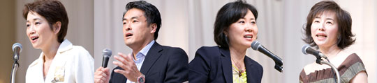 ネットワーキング会場では、佐々木かをりの挨拶の後、東京日産の社長に就任された林文子さんが、朝から参加した会議の感想を述べての乾杯のご発声。食べ放題飲み放題のビュッフェ形式で、参加者は、よく食べ、よく飲み、よく笑い、名刺ボックスを片手に、たくさんの方々と名刺交換をしたり、話をしたりしています。会場内のあらゆるところで笑いが絶えず、握手や名刺交換などをする姿が。参加者のエネルギーは留まることがありません。新たなネットワークが築かれていく様子を感じる事ができました。