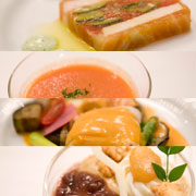 2人のパワフルな講演を聞いたところで、そのままランチ。毎回、メリディアンホテルの着席コースランチは、お楽しみの一つ。今年は、トマト・カリフラワー・赤ピーマンなどの南仏野菜、ハーブ、その他季節の野菜をふんだんに使った色鮮やかなテリーヌ、ラタトゥイユ、冷製スープなど。トータルで、737.68キロカロリーですが、ボリュームも十分で、豪華で、美しく、美味しいものばかり。そしてデザートは、がらりと雰囲気が変わり和風に。沖縄黒糖のムースの白玉飾りぜんざいのソースが登場。新鮮な組み合わせによるニューテイストに、思わず笑顔がこぼれます。豪華で美味しい食事に、講師の方も、参加者も、舌鼓を打っていました。