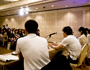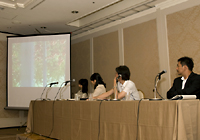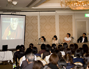 この分科会の講師は、スタジオジブリの百瀬義行氏、日活の野間清恵氏、龍村仁事務所の龍村ゆかり氏、そして、フジテレビジョンの織田雅彦氏の4名。同じ映画業界にいながら、まったく違う分野で活躍されている講師陣とのディスカッションが、ファシリテータをつとめる織田雅彦氏の軽快なトークで進行していきました。
