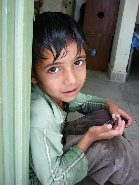 パキスタンの夏は毎日40度を越える熱さです。地震被災者キャンプで暮らすこの孤児の男の子は頭から水をかぶって暑さを凌いでいます。