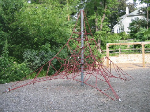子どもたちが遊ぶ公園のジャングルジムです。赤い太いロープで結構固く作られています。米国では、州によって14歳以下(年齢も州によります)はたとえ家でも子どもたちだけになってはいけないという法律があり、違法行為は保護者が罰せられます。法律がなくても、危険なせいか子どもたちだけで公園で遊ぶ姿はありません。大人が一緒にくるせいか、この公園のブランコは、大人の胸の高さくらいあり、抱っこして乗せてもらって遊びます。ことばがなくても一緒に楽しく仲良く遊べるのは、どの国の子どもたちも共通でしょうか。