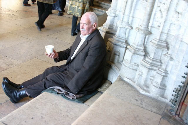 ポルトガルのジェロニモス修道院に行った時の一コマです。観光地といえる場所には、若い人から老年の方まで多くのジプシーが、観光客目当てにポストカードなどを売っています。しかし、この方は歩く事もできずに座って物乞いだけしかできません。いつもこういった切ない目をしているのかと思うと、胸が張り裂けそうになりました。老若男女平等に笑顔が訪れる事を祈るばかり。