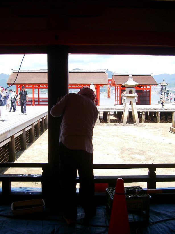 7月初旬に広島に出かけたとき厳島神社に参拝しました。2年前の台風で大きな被害があったあと、まだ修復が続いているようです。日曜日でしたが本殿向かい側の回廊の柱の下地塗りの作業が観光客が行き交う中も続けられていました。平日はまだかなりの工事が行われているとのこと。今年も豪雨など気候が不安定なので心配です。