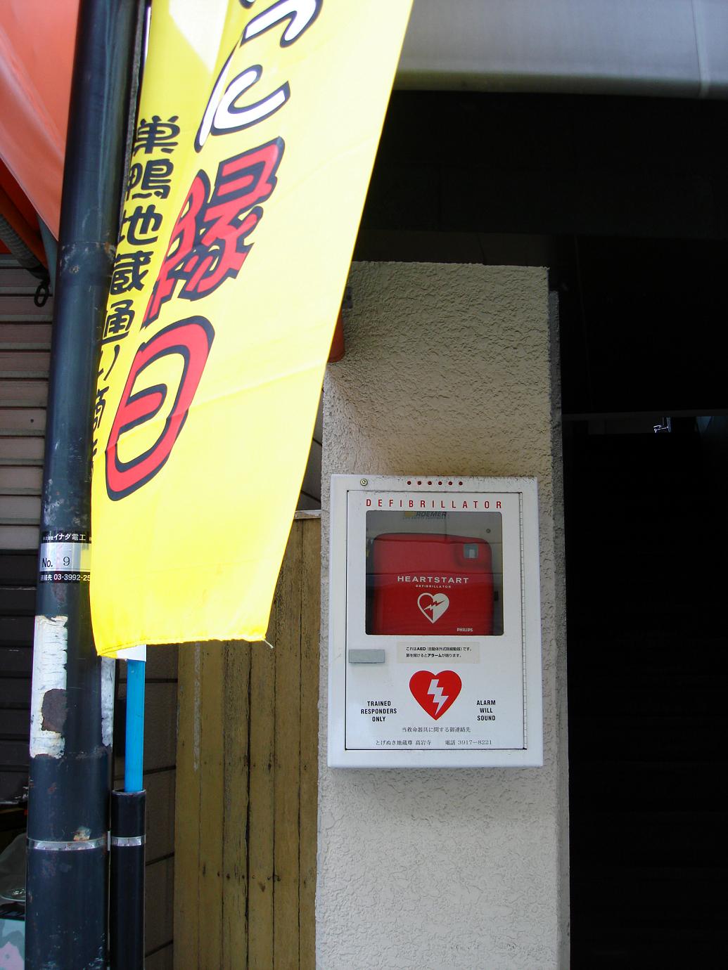 巣鴨のとげ抜き地蔵通り商店街で見かけたAED※です。お年寄りの多く集まる街、さすが、と感心しました。機械の出番がないのが一番ですが、もしもの時にはこれで誰かの命が助かることを祈ります。