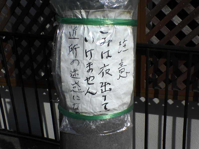 夜間早朝のゴミをからすが狙い、周辺はいつも散らかってしまいます。たまりかねた住民が張り紙をしたのですが……。カラスよけネットは自治体ごとの購入になるのですが、この地域ではまだです。ネットがない場所ではまだまだカラスのえさ場となってしまうのです。