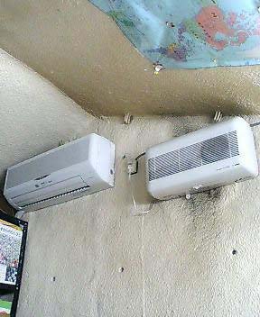 わが家のロフトの空気清浄器とエアコンです。壁のこの汚れの原因は?室内の空気がこんなにも汚れているとしたら、少し恐ろしい気がします。