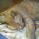 気持ち良さそうに寝ているネコは、わが家のみよちゃんです。3年前、捨てられていたのを拾ってきました。わが家のアイドルです。陽当たりのいいリビングにて。