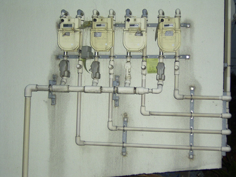団地の壁にあるガスのメーター類。何だかモダンアートの展覧会場へまぎれこんだみたい