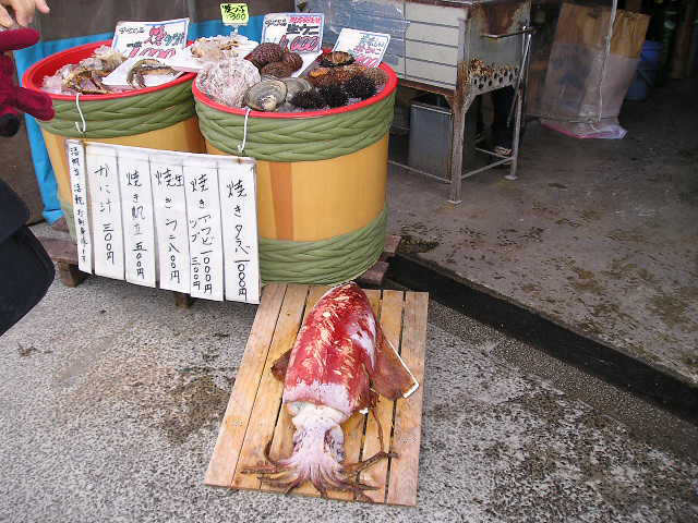 バスツアーを利用して、函館に行きました。朝市で、すごい大きなイカ(烏賊)を見ました。食べたら美味しいのかな?