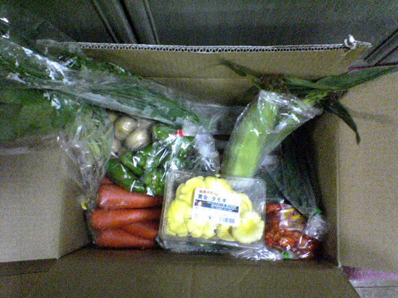 八百屋さんのオススメネットでよく買い物をしている、静岡の八百屋さんから届いた「おまかせセット」です。お値段は毎回決まっていて、その中で旬のものを店長さんが選んで入れてくれます。中央の黄色いのは、「こがねタモギタケ」。新種のきのこだそうです。写真のとうもろこしは甘くておいしいです!おまけも入れて17種類もあり、大変お買い得なセットです。2週間に1度届くのですよ。 撮影場所: - 撮影日時: - 投稿日時: 2004/06/23 撮影者: べんじゃみん