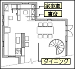 上の図面は、戸建でキッチンと並列の家事室の隣に、本棚で間仕切って書斎をつくった少し余裕のあるプラン。小窓に向かって置いたL型の机の両側はたっぷりの収納です。これだとあいみっきーさんのように台所を気にしつつ、お子さんが帰ってきても背中で仕事を続けている様子を伝えることができるかもしれません。