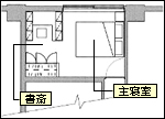 下の図面は、マンションの7.6畳の寝室にWベッドを置いて、部屋の左隅にL型の机と両サイドに本棚をプランした例。案外、家具のレイアウトによってワークスペースを作り出せる場合もありますので、図面とメジャーを持って部屋やちょっとしたくぼみを計ってみてはいかがでしょう。