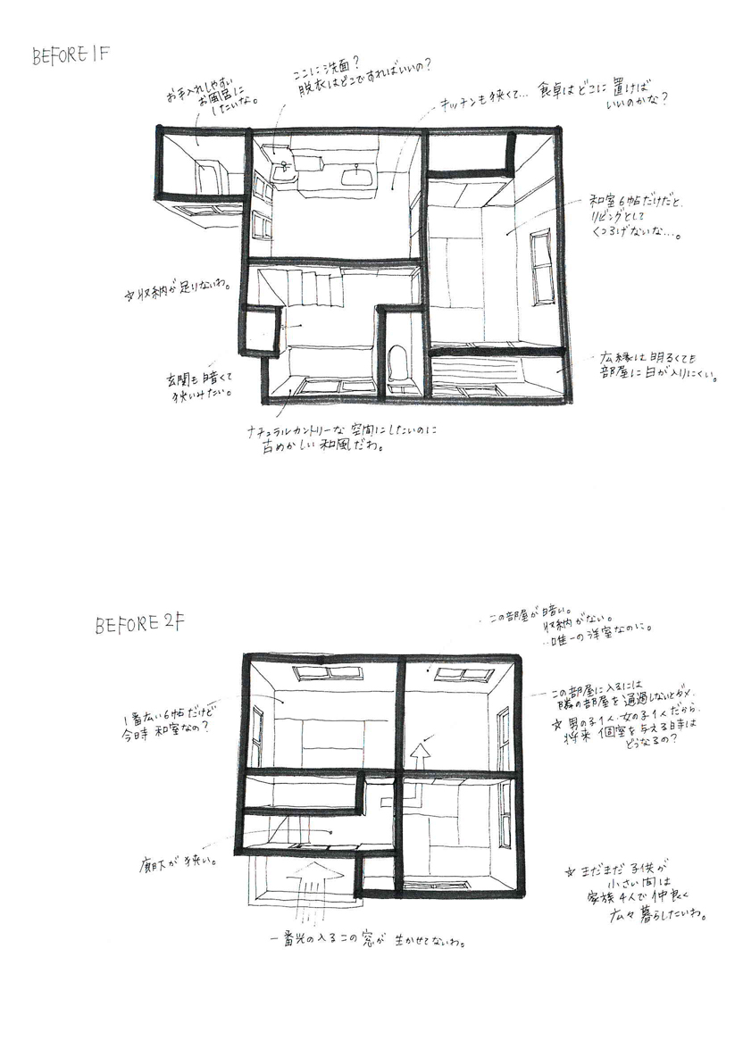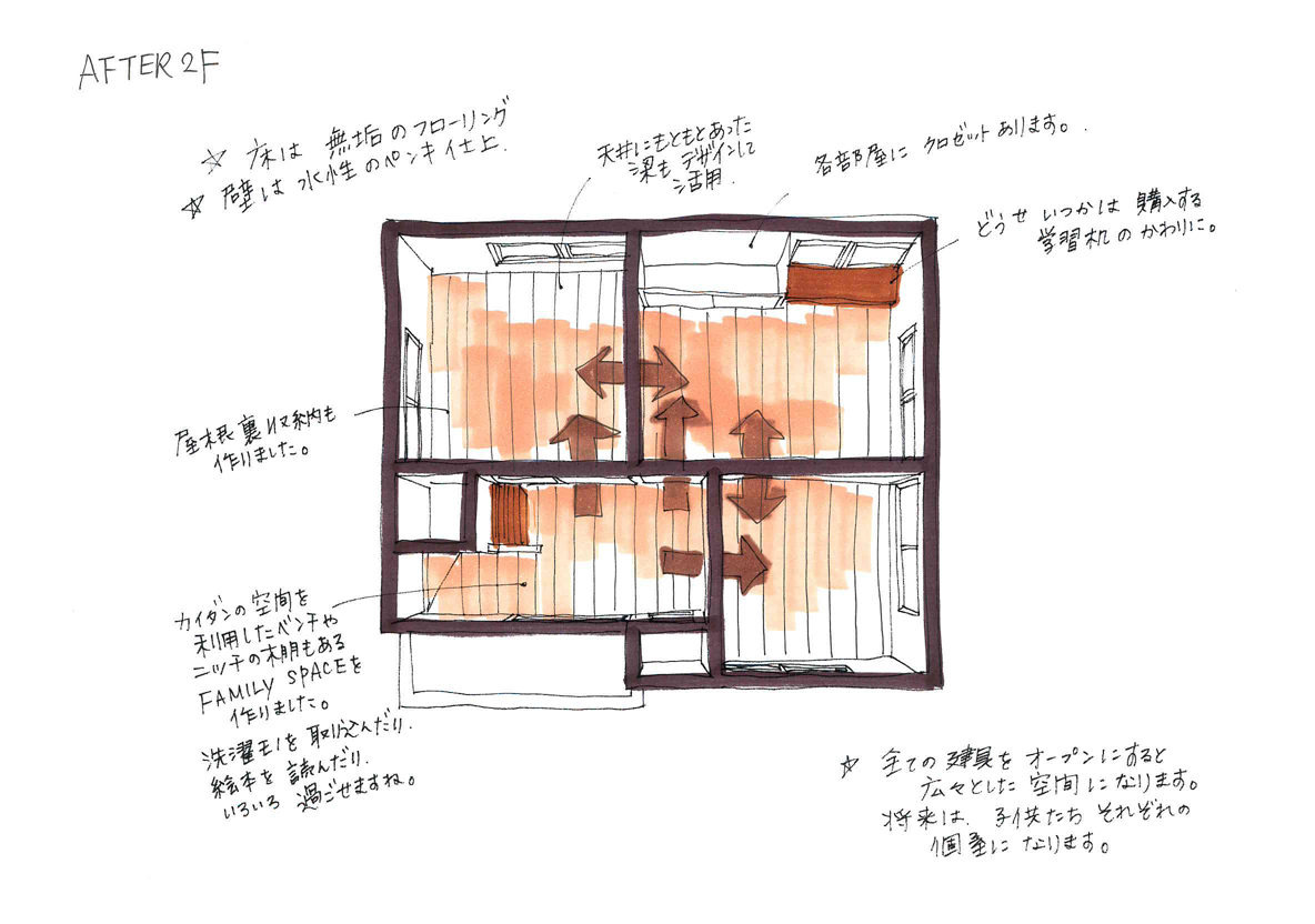 2階1)暗くて狭い廊下は、広くて明るいファミリースペースに。ベランダの洗濯物を取り込んだりベンチや棚を設置して絵本を読んだり。