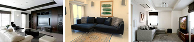 リフォームの場合、戸建は容易ですが、マンションは梁が配線を妨げたり、プロジェクターの取り付けに補強が必要だったり、照明器具との絡みもあったりで、天井を壊すような工事でしたら隠蔽配管が可能です。賃貸の場合は、露出配線をできるだけきれいに仕上げます。写真左は、新築のマンションでご入居前に天井を壊してスピーカー等を天井に埋め込んだ例。写真中央はリフォームで天井を壊して、ソファの後ろの壁にスピーカーを取り付けた例で写真右は賃貸マンションなので、人が通らない場所を選んでラグの下に配線をした例です。