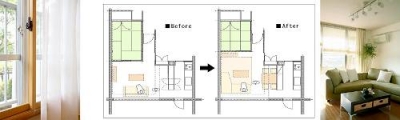 上の図面と右の写真は部分リフォームをしたコンパクトなリビングイニング。左図がBeforeで、I型のソファで首をひねって左横のTVをご覧になり、キッチンとの境の収納扉を開けるために、動かせる折り畳みのダイニングテーブルをご利用でした。右図のAfterでは、L型ソファに座りTVを正面に観て、常設のダイニングテーブルが置けるようになりました。このとき、部屋の寸法とともに、家具の巾・奥行・高さ、窓の位置と高さ・巾などを確認。(図面に人型を表記していますが)動作・動線については、ソファに座ってどうくつろぐか、買い物やお盆を持ってキッチンに行ったり、掃除機をかけたり、洗濯物を干すためにバルコニー(窓)を開けたり……で、ぶつからないように寸法・動線を確認します。ご自身の体を使って、お部屋で巾や動きを確認していただくとわかりやすいと思います。