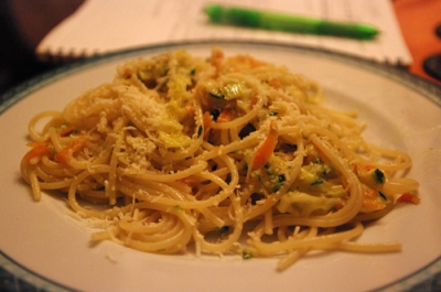 1)ズッキーニ、ちりめんキャベツ、にんじんは細切りしておく。 ポロネギは小口切り、パルミジャーノは