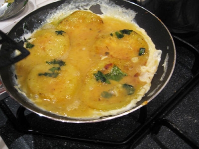 1)緑トマトは5ミリ厚位に切り、小麦粉をまぶし、フライパンにたっぷりのオリーブオイルをひき、ゆっくり
