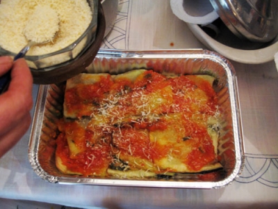 2)焼き型に1)の茄子をしき、半量のサルサ・ディ・ポモドーロ、パルミジャーノを加える。同じように