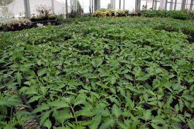 ハウスの中で、植えつけを待つトマトの苗。8月には色、形が様々なトマトが楽しめます。