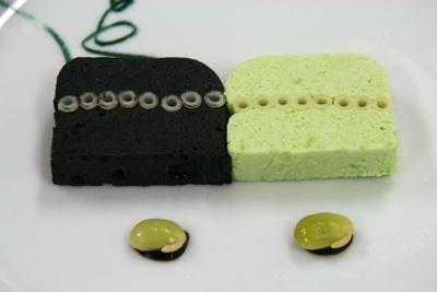 枝豆に限らず、豆は玉村の大好物。写真は玉村レシピの豆とイカスミのテリーヌ。カフェで開く「玉さんディナー」で召し上がっていただいたものです。