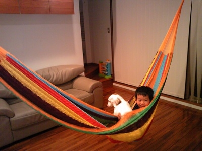 お家ハンモック、最近大人にも人気ですが、もちろん子どもも大喜びですよ
