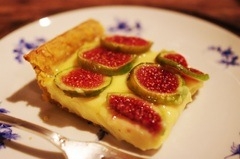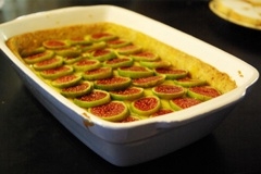 6)焼き上がって生地が冷めたら、4)のカスタードを冷凍庫から取り出し、 ヴィンサントを加えてクリーム状になるまで混ぜ、型に敷き込む。その上に2)で用意したイチジクをきれいに並べる。