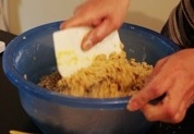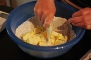 1)生地(パスタフローラ)を作る。大きなボールに生地の材料をすべて入れ、バターをスケーダーで切るようにし、指でバターをほぐしながら、粉となじませ、程よくまとまるまで混ぜる。