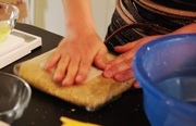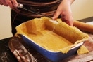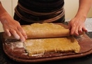 5)麺台の上に粉を振り、休ませておいた生地を冷凍庫から取り出し、麺棒で5ミリ厚になるまで延ばす。延ばした生地を麺棒に巻き付けて、焼き型の上に乗せ、余分な生地をナイフで切り取る。どちらも180度のオーブンで20分くらい焼く。