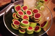 3)トッピングを用意する。緑イチジクは洗って水気を完全に切っておき、3〜5ミリ厚の輪切りする。