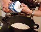 4)フィリングを作る。鍋に牛乳を入れ、沸騰直前まで温める。別のボールで卵、さとう、小麦粉、片栗粉を泡立て器で混ぜ合わせ、そこに沸騰直前の牛乳を鍋から加え良く混ぜ、元の鍋に戻し、中火にかける。泡立て器で絶えず混ぜ、プクプクしてきたら焦げないように気を付けてさらに1分混ぜ、火を止める。バットに移し、ラップをして冷凍庫で30分くらい休ませ、あら熱を取る。