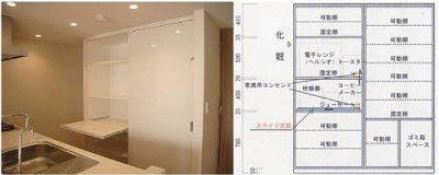 下の写真は、昨日、取り付けたばかりの食器棚、冷蔵庫(予定)の隣に、巾1,770mm、高さ2,150mm、奥行600mmと一般的なサイズながら、収納力は抜群。引き戸で中が見えないように&家電は引き出して使います。左側は上から食器類、中央に手前に引き出して使う家電を含め、前面だけで5台の家電、下部はホットプレートや大きな鍋、保存食などを収納。右側は上部から中央にかけて食器、左下に野菜など、右下にゴミ箱です。ほとんどが可動棚。耐震ラッチも便利ですが、引き戸も安心。こちらでは小さなお子様がいたずらしないように上部につけたラッチもあり、地震対策も万全です。