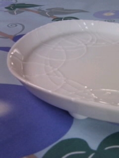 これは作家さんの器で、白磁にイッチン※が施されたお皿です。コロンとしたあめ玉のような三つの足が付いているので、食卓に出した時に平らなお皿より印象的です。お皿の形も不規則な円でなんとも表情が豊かです。