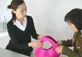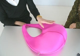 こんなに丸みがあって、中にいろいろ入るのですが、一枚でしょう? 立体裁断なんですが、つくる側からするとこれが難しい技術なんです。