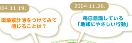 2004年11月から3ヶ月間に渡って行われた「100人委員会」第2期。環境家計簿をつけながら地球にやさしいくらしを考えたい!と、今回も国境を越えたさまざまな地域からたくさんの方々が声を上げてくださいました。 3ヶ月間、活発に出された100人の知恵や工夫、それぞれの地域の実態、環境に対する考えをここに発表します。100人の仲間とともに毎日の生活を見直してみませんか。