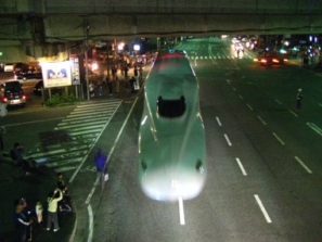 土曜になったばかりの深夜3時、福岡の街の中は騒然としていました。昨夜に続き、神戸の工場から博多港に船で運び込まれていた山陽・九州新幹線の相互乗り入れ車両が、福岡県那珂川町にある新幹線車両基地に運ばれるために、線路ではなく一般道をトラックに乗せられ運ばれていきました。この日は深夜にもかかわらず、小さい子どもを連れた親子、鉄道マニアなど大勢が道を走る新幹線を見守っていました。この新幹線はまだ名前は決まっていないようですが、2011年春から山陽・九州新幹線相互直通運転車両として走ります。
