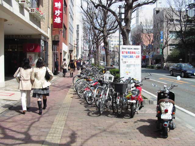 汚名返上のために福岡市天神地区は13年度の放置自転車全国ワースト1になってしまい、「チャリ・エンジェルズ」という放置自転車対策の広報隊を作り、街中には自転車を止めると指導する係を置くなどし、日々、汚名返上に努力しているようです。しかし、係員がいないところでは相変わらずの状態です。駐輪場も増やし、料金は3時間まで無料にするなどの対策の効果もまだまだなようです。 撮影場所: 福岡市中央区天神 撮影日時: 2004/03/18 投稿日時: 2004/03/19 撮影者: いつこ |
