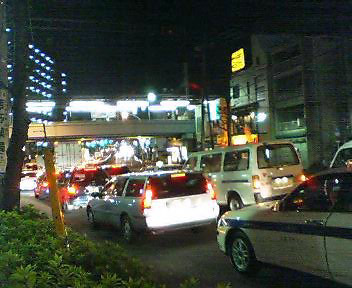 交通の絶えることのない通りです。夜9時半でも、昼間の流れとまったく同じ。返って増えているのかも。