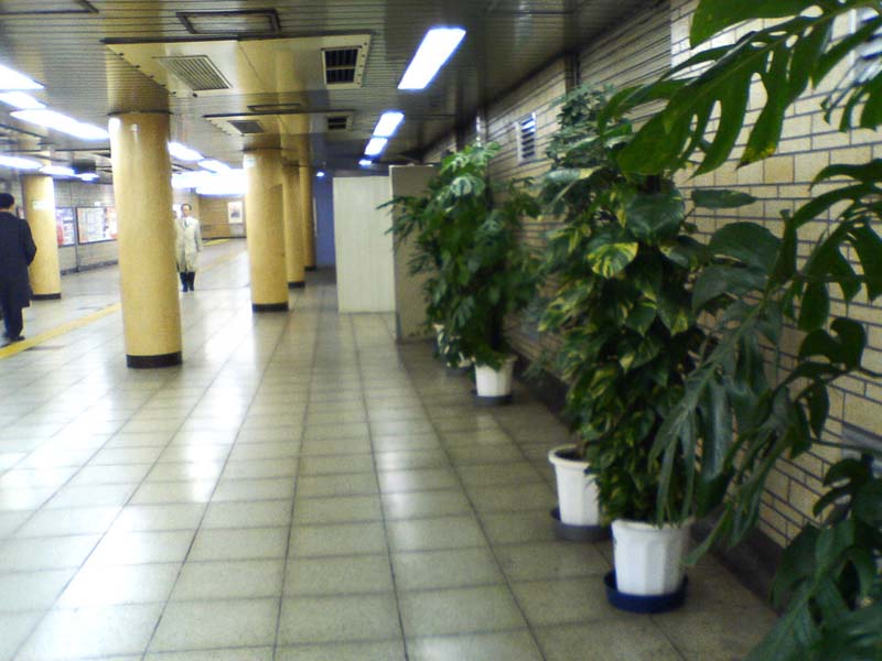 屋上緑化ならず、地下緑化!? 丸の内線:赤坂見附から有楽町線の永田町へ乗り変える地下鉄通路脇にある植木鉢。この乗換え通路はおよそ450メートルもあるので、途中に緑があると少しは目がいやされるかしら、と思いました。それにしても歩くのが大変です。