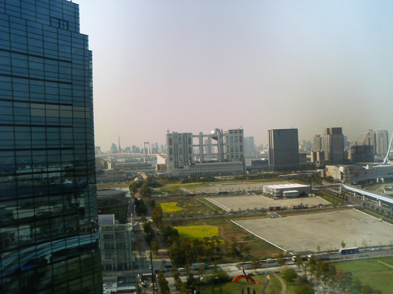 テレコムセンターからお台場フジテレビを眺めて。ビル群から垣間見ることのできる東京タワーは東京のシンボルです。